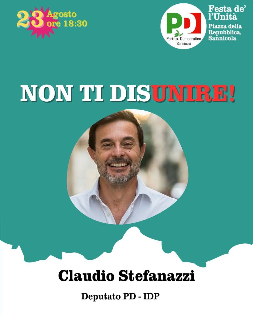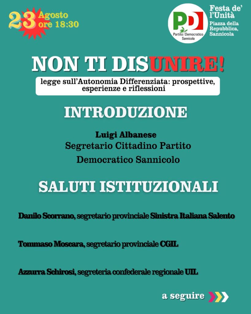 Domani si terrà la festa de l’Unita a Sannicola e sarebbe davvero un’ottima cosa partecipare in tanti. La prima festa nella nostra provincia che, tra l’altro, avvicinerà il partito alla festa provinciale che la Federazione PD di Lecce terrà ad Aradeo il 27, 28 e 29 settembre.